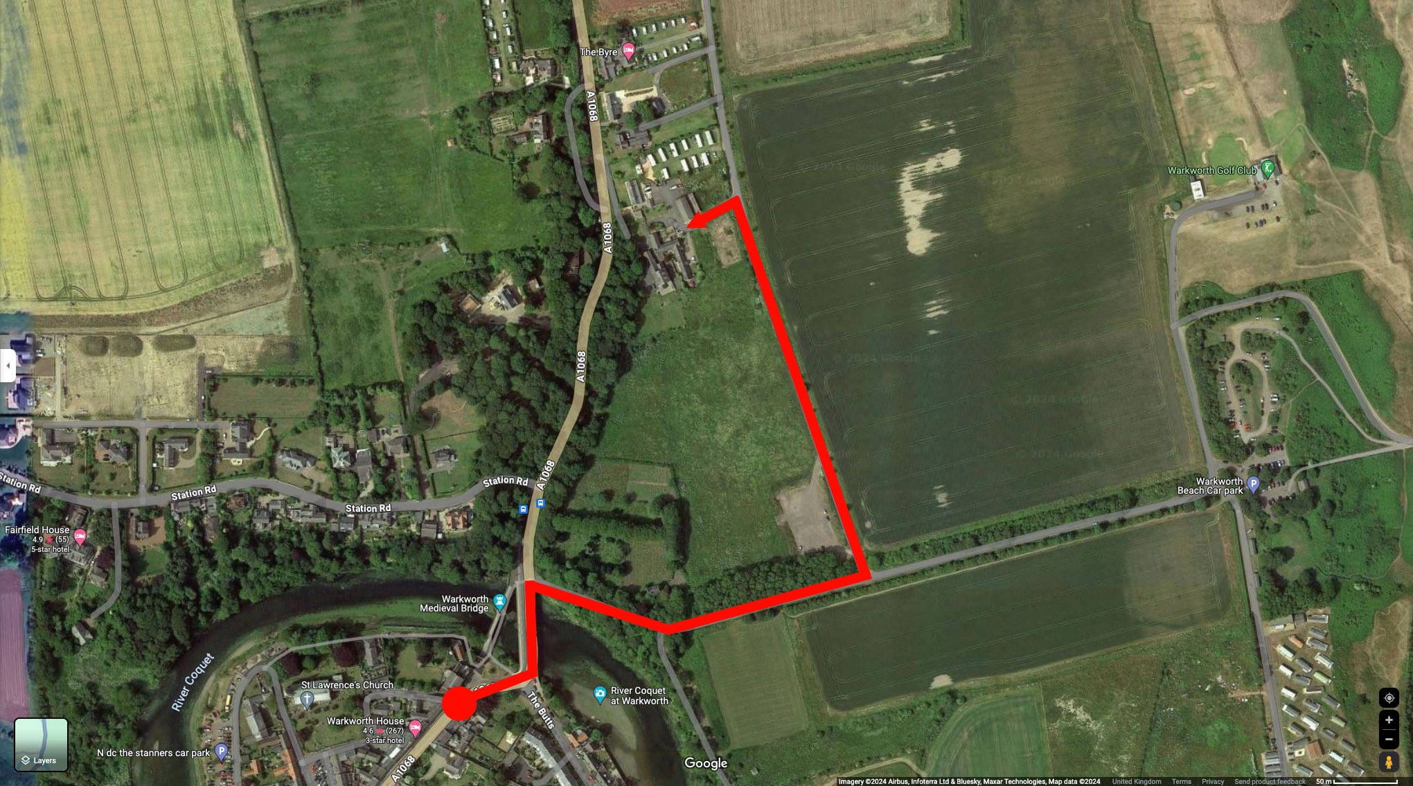 This map shows how to arrive at The Joiner’s Cottage when you drive North out of Warkworth village. The postcode of the property is NE65 0XS.
